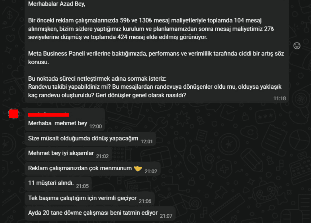 Reklamlar yayına girdikten sonra mesaj ve profil etkileşimi gelmeye başlayacaktır. Genelde 3–5 gün içinde ilk net veriler oluşur. Ancak “asıl sonuç” (randevu/satış) stüdyonun sürece ne kadar hızlı adapte olduğuna bağlıdır: mesajlara dönüş hızı, teklifin netliği, içerik üretimi ve mevcut randevu akışınız bu noktada belirleyicidir.